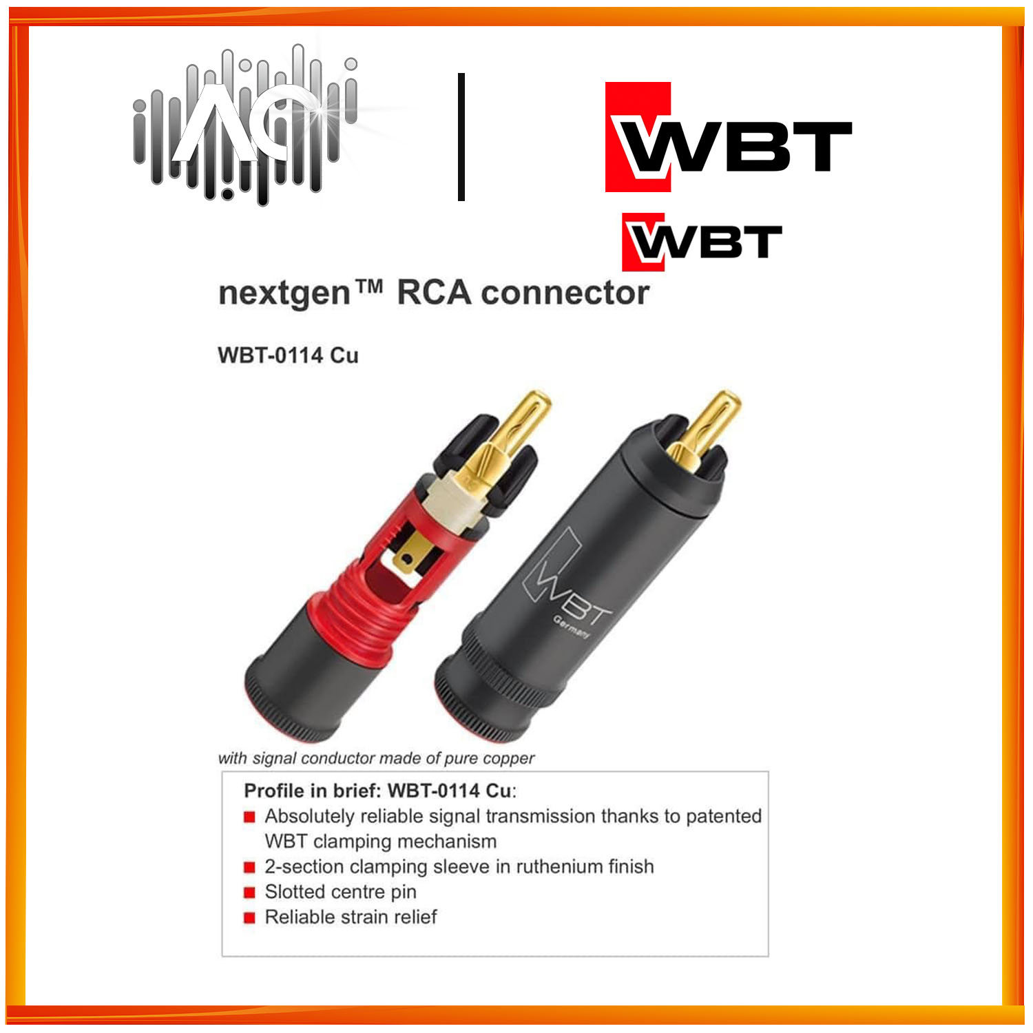 When combined with WBT RCA sockets, the contacts are positioned in such a way that the outer conductor is in contact before the inner conductor, thereby preventing undesirable or even harmful voltage peaks.