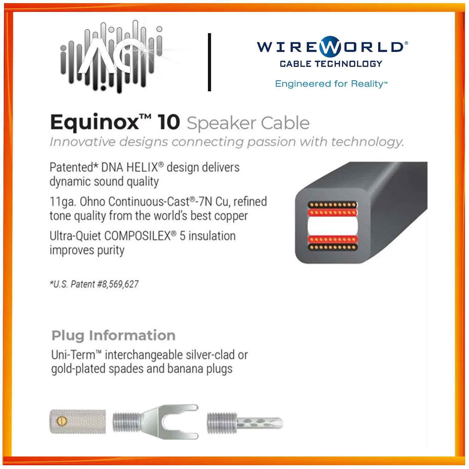 The Equinox 10 speaker cable is an 11 AWG cable that provides amazing value to owners of premium quality AV systems. This audiophile speaker cable retains the vivid three-dimensional sound of Wireworld’s esteemed Eclipse Series and is affordably priced to fit a wide range of quality A/V systems. With twice as many strand groups and greater stability than Equinox 8, this cable sounds more alive in every way. The upgrade to OCC-7N Copper provides greater clarity and wider dynamic contrasts than Oasis 10. Standard or Biwire speaker connection available. In-wall rated CL3 / FT4.