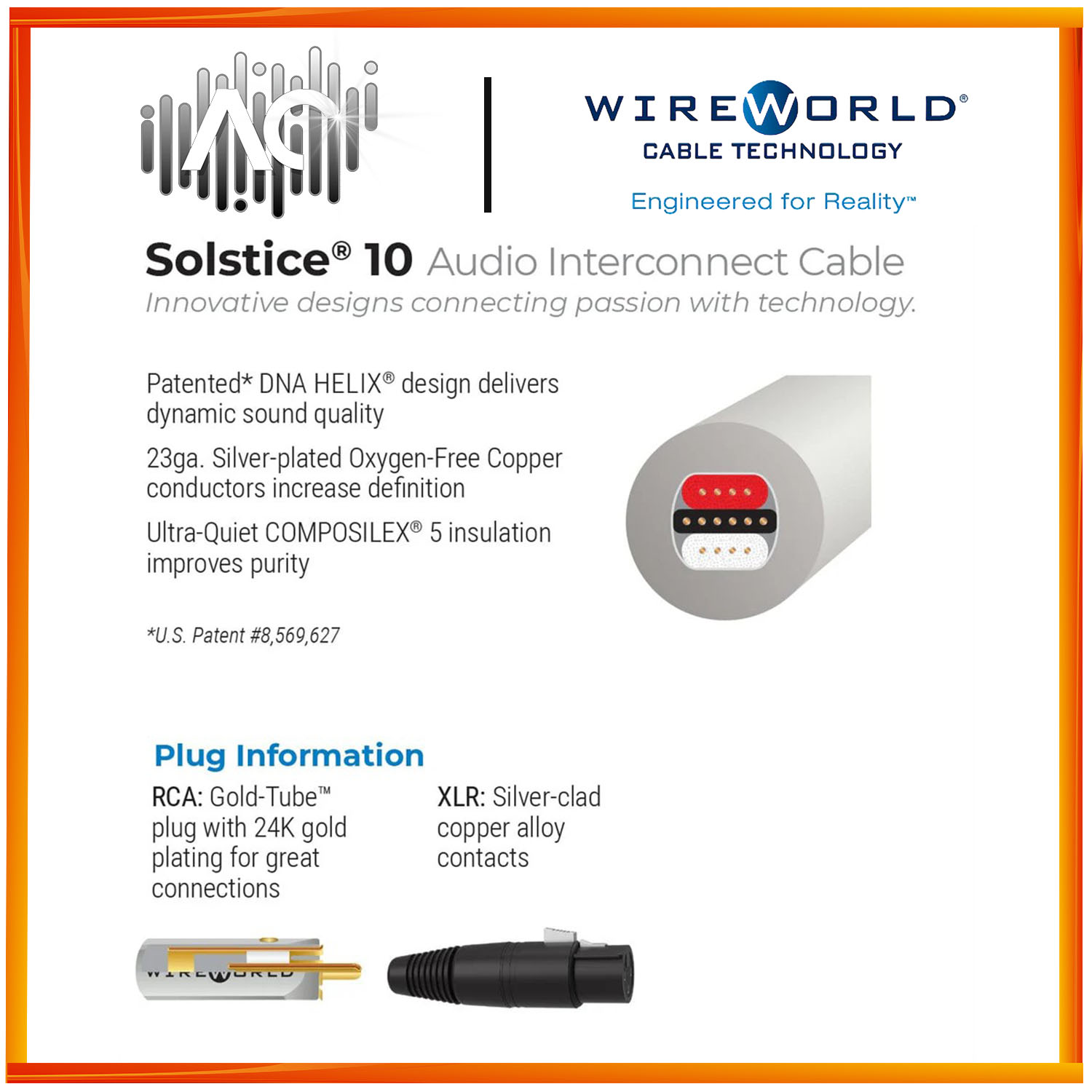 With a refined version of Wireworld’s patented Tri DNA HELIX design, Solstice 10’s silver-plated Oxygen-Free Copper conductors and COMPOSILEX 5 insulation improve reproduction of musical detail and expression in both RCA and balanced XLR applications. This audio cable features Gold-Tube™ RCA plugs with a smooth firm grip and 24K gold-plated OFC contacts. Available with XLR or RCA plugs in standard and custom lengths.